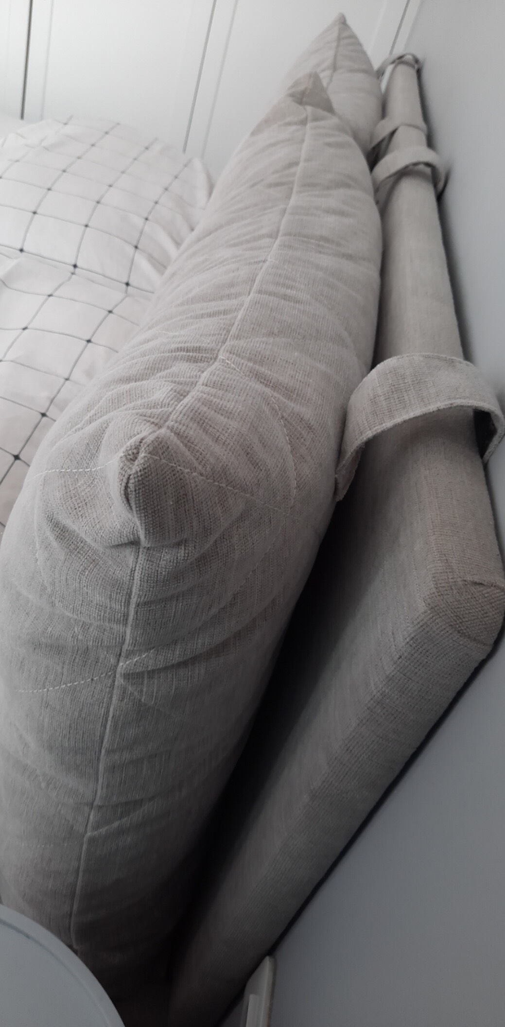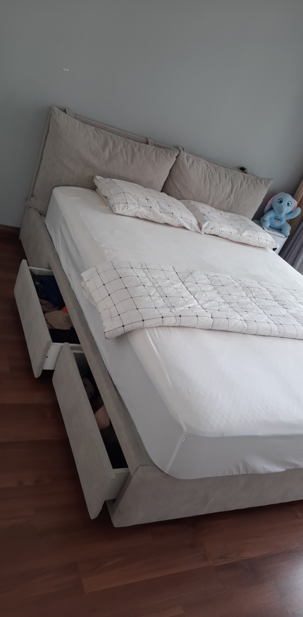 Khung giường được bọc nệm nỉ êm ái, sang trọng.