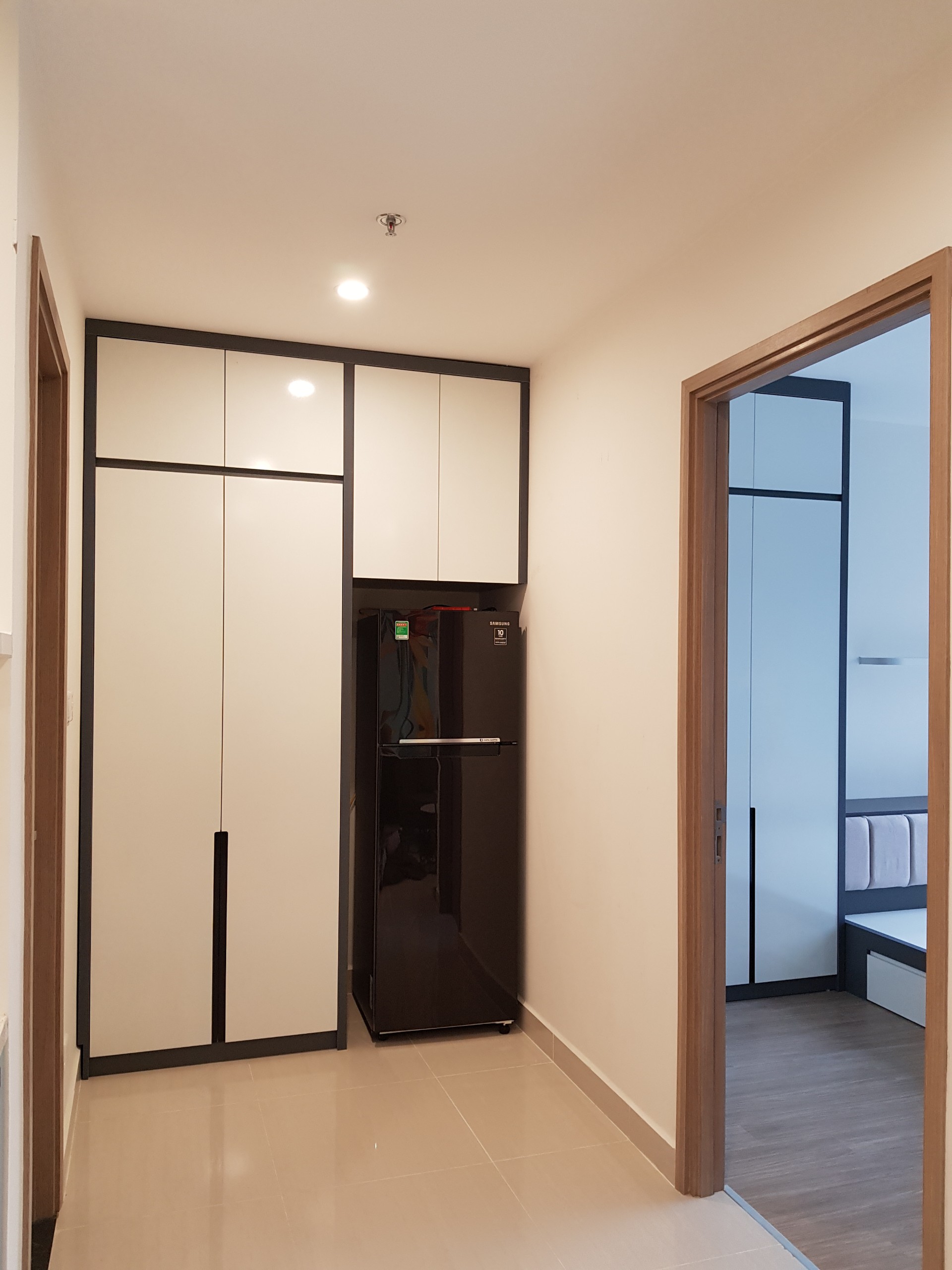 Tủ lạnh kết hợp tủ trữ đồ bằng gỗ MDF chịu ẩm cốt xanh, mặt cánh tủ sơn trắng.