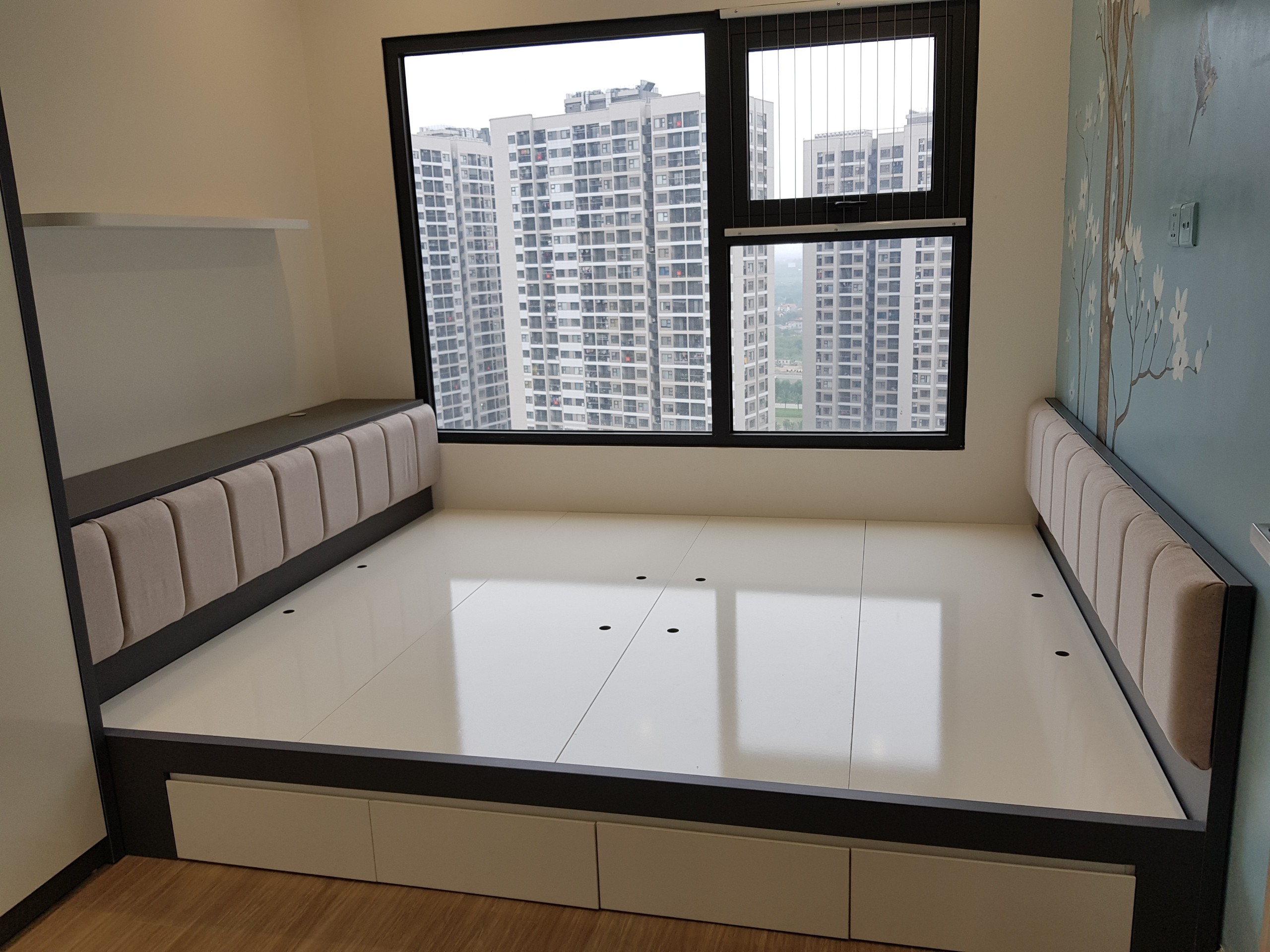 Giường ngủ với hệ tủ kéo trữ đồ tối đa cho phòng diện tích nhỏ. Khung MDF, thang bằng thép hộp, dát giường tấm chịu lực sơn trắng bề mặt, đầu giường bọc đệm nỉ.