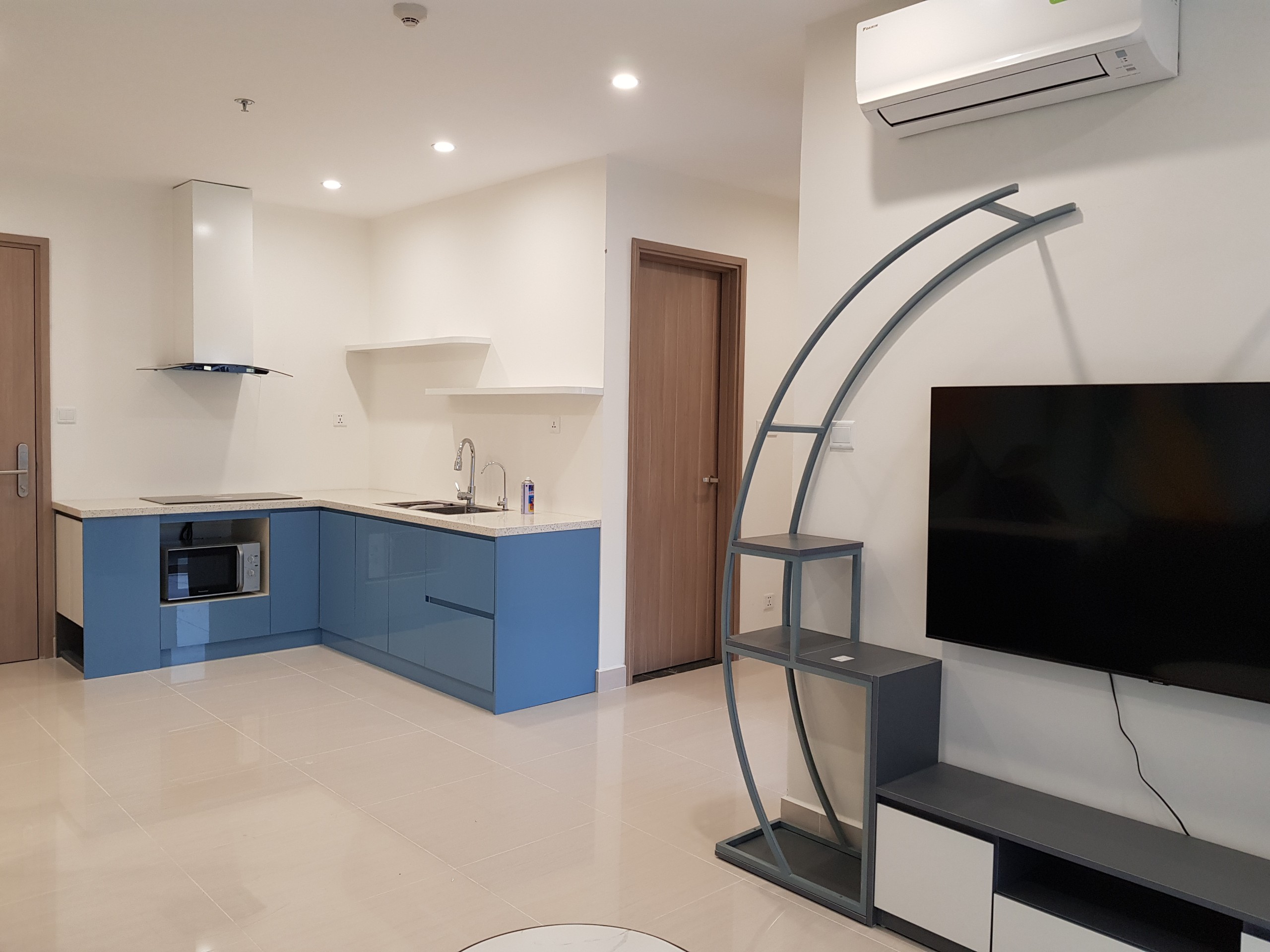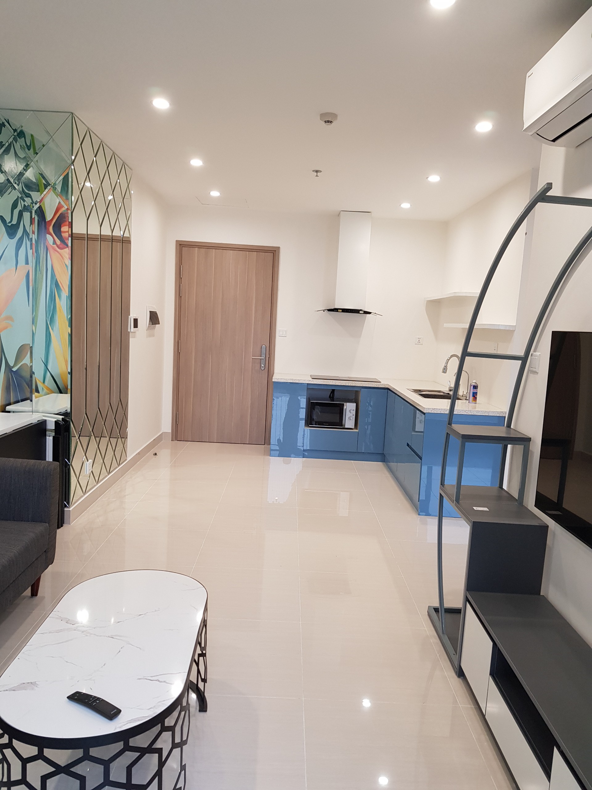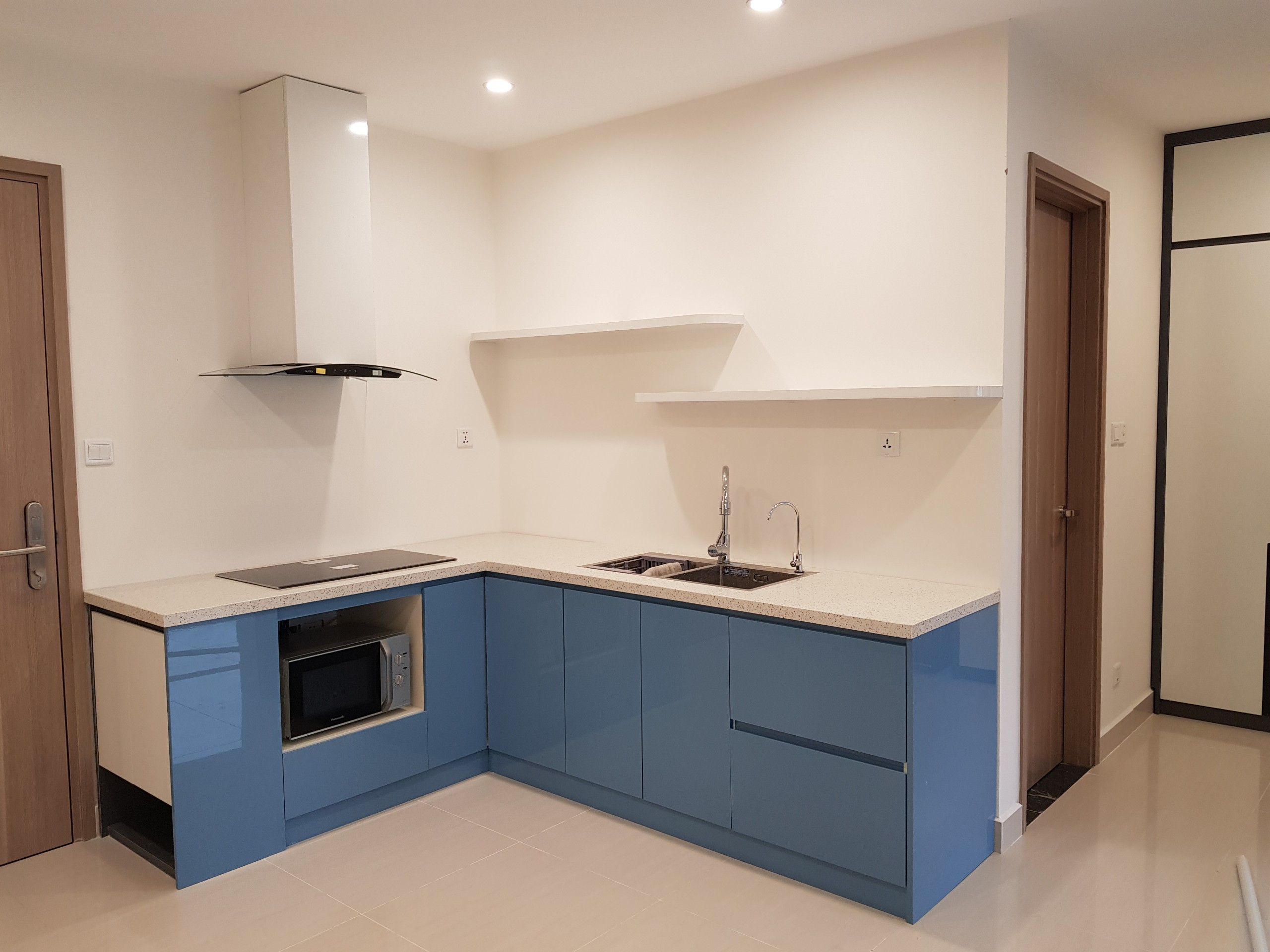Gian bếp hiện đại, đơn giản nhìn từ view khách. Căn hộ lưu trữ đồ hạn chế, bếp rất hiện đại với chỉ tủ dưới, tủ trên biến tấu thành các kệ trang trí, không có chức năng lưu trữ đồ. Mặt đá, cánh Acrylic bền, đẹp và dễ dàng vệ sinh trong quá trình sử dụng.