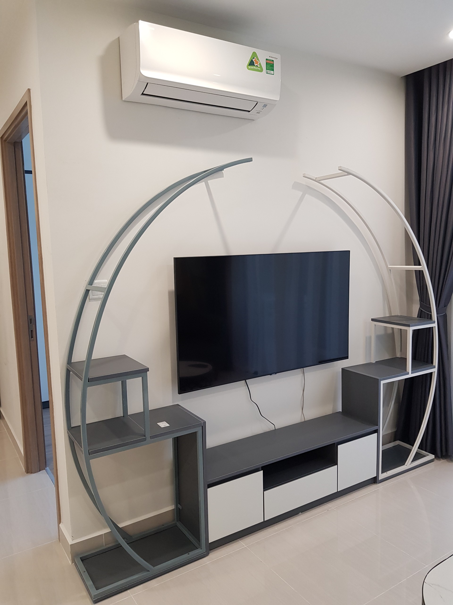 Phòng khách với hệ tủ kệ decor cách điệu kết hợp giữa gỗ và thép sơn tĩnh điện.